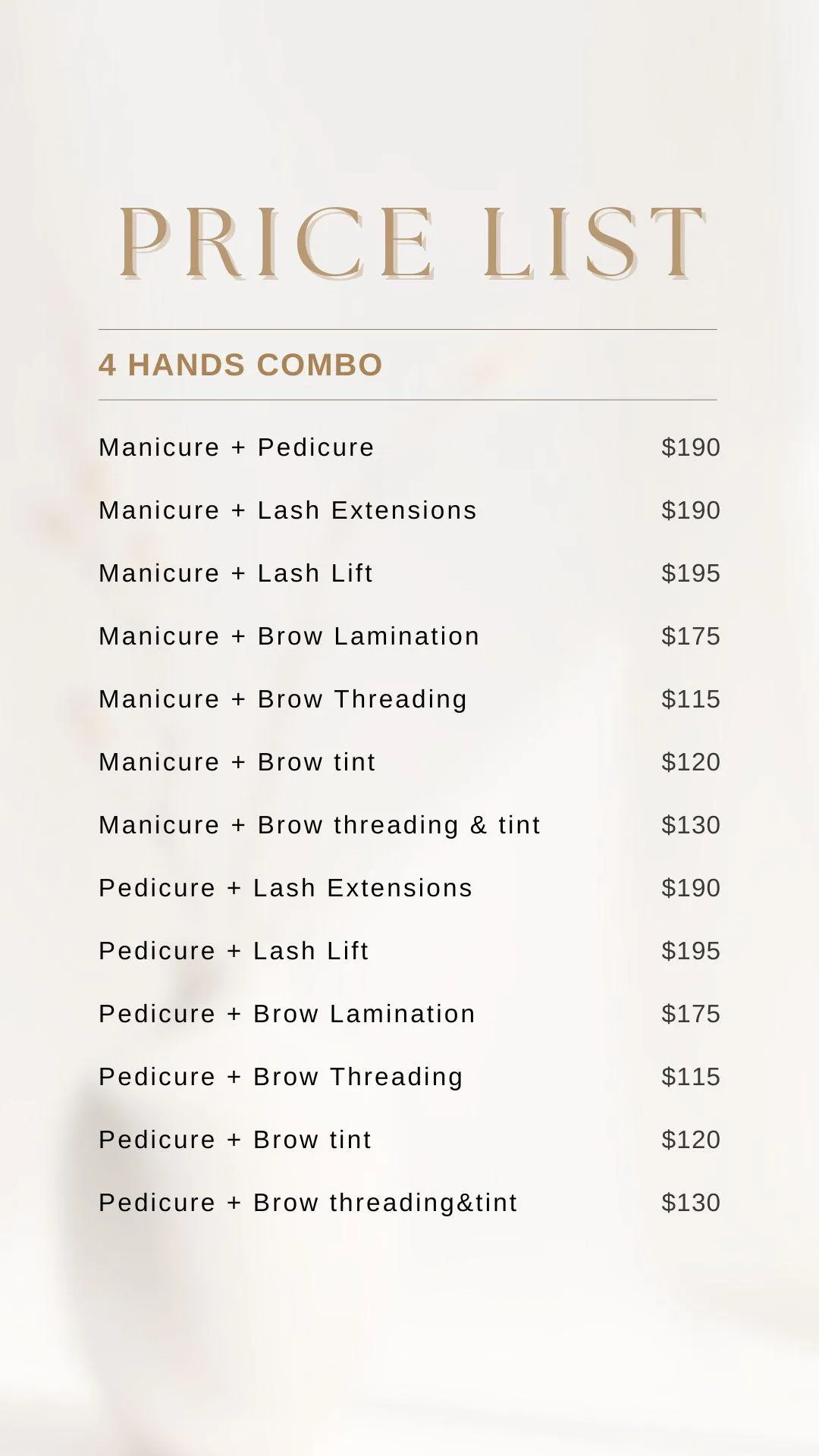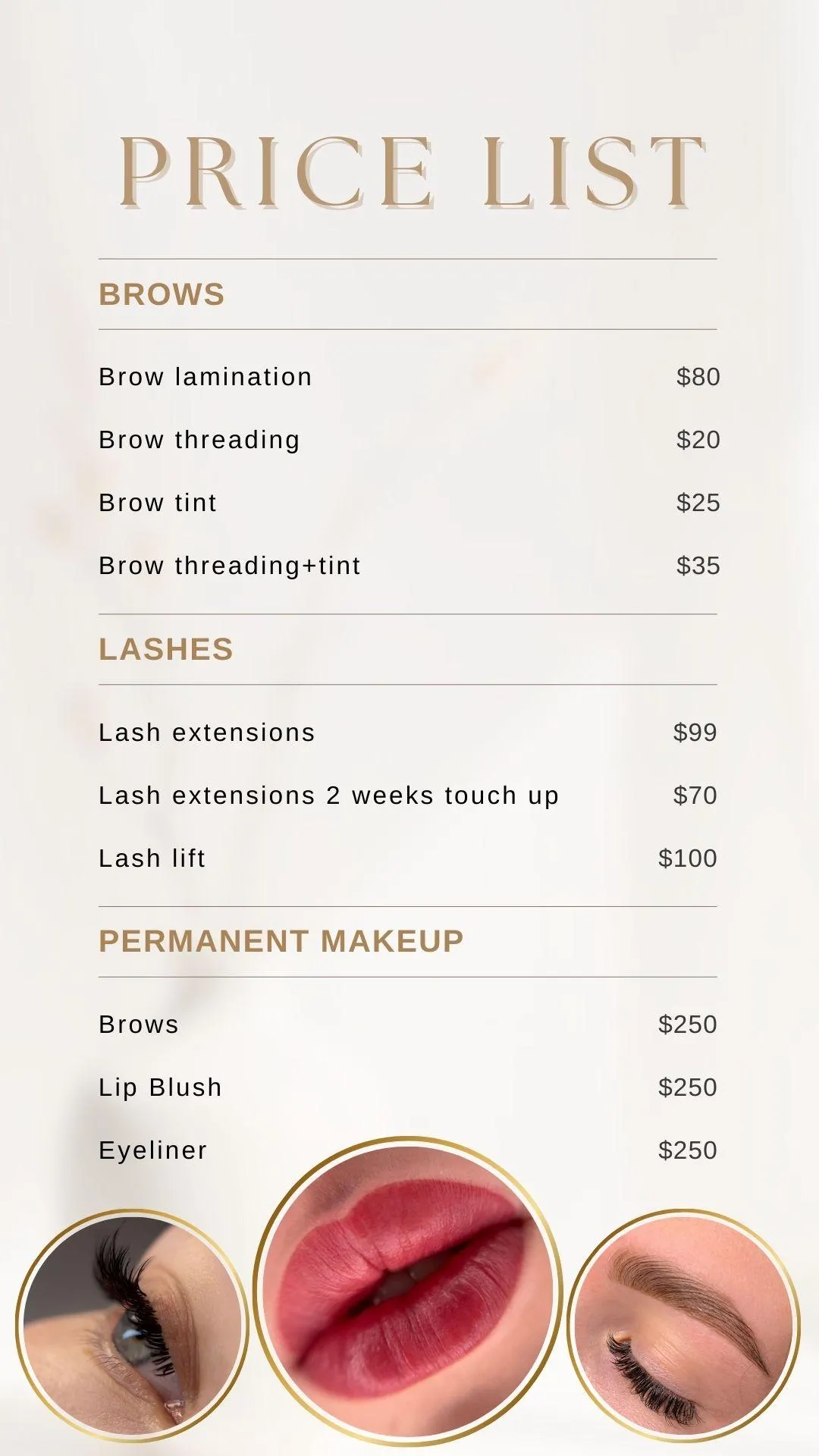 Explore our prices for beauty services in Florida: brow threading, lamination, lash lift, tinting, manicure and pedicure.